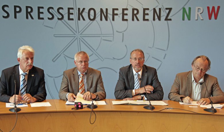 StGB NRW-Präsident Bürgermeister Roland Schäfer (2.v.rechts) neben OB Norbert Bude (2.v.links), Landrat Thomas Hendele (links) sowie dem LPK-Vorsitzenden Leo Flamm bei der Pressekonferenz zum Inklusionsgutachten am 15.07.2013 im Düsseldorfer Landtag