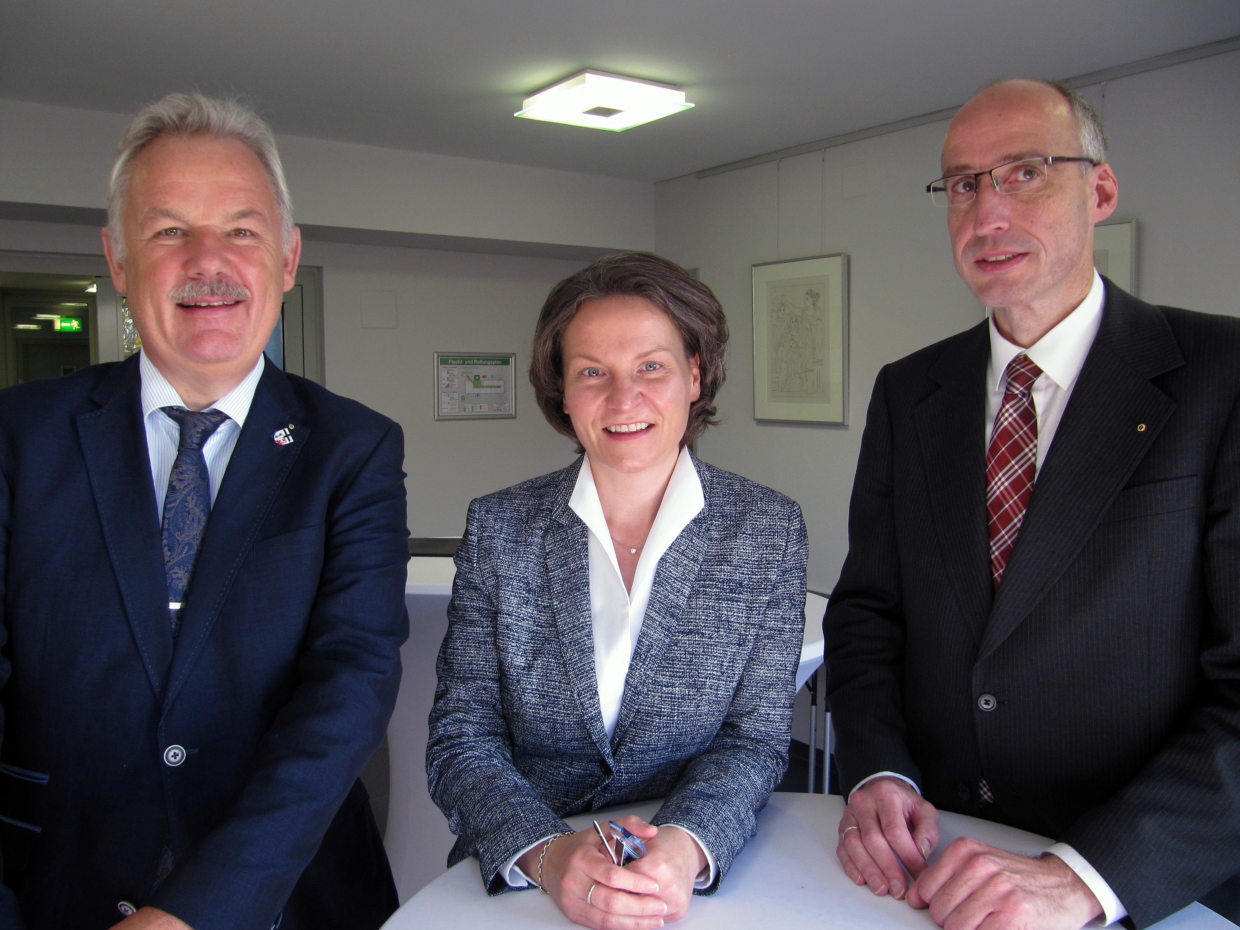 Im Bild: NRW-Ministerin für Heimat, Bau, Kommunales und Gleichstellung mit dem Ausschussvorsitzenden Bürgermeister Stefan Raetz (Stadt Rheinbach, links) und Beigeordnetem Rudolf Graaff (StGB NRW) - Foto: Stempel / StGB NRW