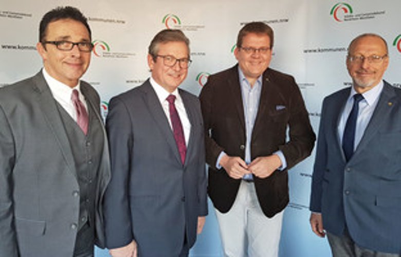 - Foto: Lehrer / StGB NRW Bild anzeigen Die am 21.11.2018 neu gewählten Vizepräsidenten (v.l.n.r.) Bürgermeister Prof. Dr. Christoph Landscheid (Stadt Kamp-Lintfort), Bürgermeister Michael Dreier (Stadt Paderborn) und Bürgermeister Kai Abruszat (Gemeinde Stemwede) mit Präsident Bürgermeister Roland Schäfer (Stadt Bergkamen)