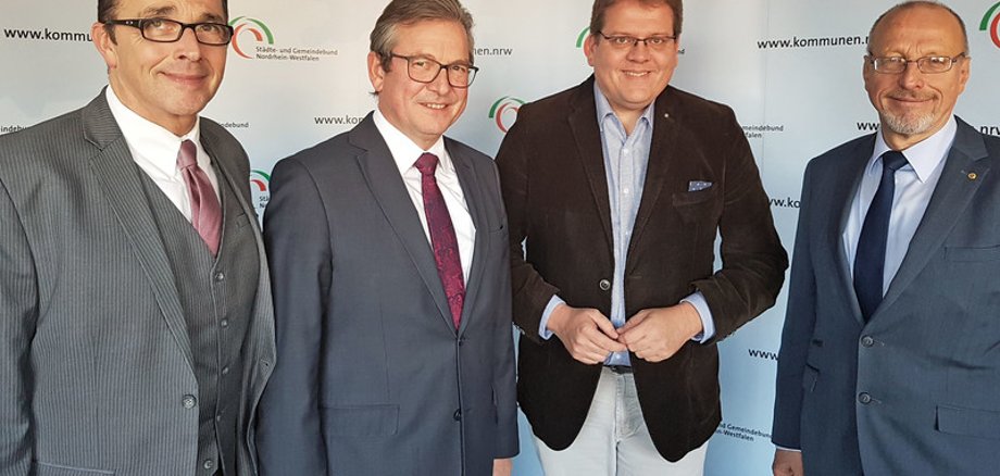 - Foto: Lehrer / StGB NRW Bild anzeigen Die am 21.11.2018 neu gewählten Vizepräsidenten (v.l.n.r.) Bürgermeister Prof. Dr. Christoph Landscheid (Stadt Kamp-Lintfort), Bürgermeister Michael Dreier (Stadt Paderborn) und Bürgermeister Kai Abruszat (Gemeinde Stemwede) mit Präsident Bürgermeister Roland Schäfer (Stadt Bergkamen)