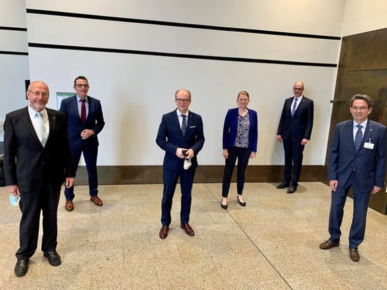 V.l. Ehrenpräsident Roland Schäfer, 1. Vizepräsident Prof. Dr. Christoph Landscheidt, Gastgeber Landtagspräsident André Kuper, 2. Vizepräsidentin Alexandra Gauß, Hauptgeschäftsführer Christof Sommer, Präsident Dr. Eckhard Ruthemeyer