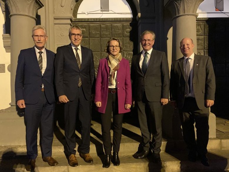 v.l.: Bernhard Hartmann, Kämmerer, Stadt Paderborn; Jürgen Frantzen, Bürgermeister, Landgemeinde Titz; Ina Scharrenbach, Ministerin für Heimat, Bauen, Kommunales und Gleichstellung des Landes Nordrhein-Westfalen; Michael Dreier, Bürgermeister, Stadt Paderborn und StGB NRW-Vizepräsident; Claus Hamacher, Beigeordneter, Städte- und Gemeindebund NRW
