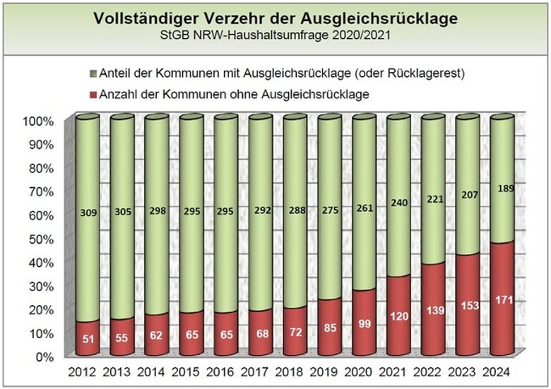 Eigenkapital und Überschuldung Einen wichtigen Teil der Erfassung bildete auch in diesem Jahr wiederum die Abfrage, inwieweit ein Abbau der Ausgleichsrücklage - des Anteils am Eigenkapital, der haushaltsrechtlich zum fiktiven Haushaltsausgleich eingesetzt werden kann - sowie ein Abbau des Eigenkapitals im Übrigen stattfindet. Insgesamt geben 171 Mitglieder (47,5 Prozent) eine eingetretene oder erwartete Aufzehrung ihrer Ausgleichsrücklage an. Bis Ende 2021 erwarten 120 StGB NRW-Mitgliedstädte und -gemeinden den vollständigen Verbrauch ihrer Ausgleichsrücklage und für die drei Folgejahre noch einmal 51 Städte und Gemeinden. Dies bedeutet, dass im Finanzplanungszeitraum 171 der 360 befragten Kommunen - über 47 Prozent - mit einem vollständigen Verzehr ihrer Ausgleichsrücklage rechnen.