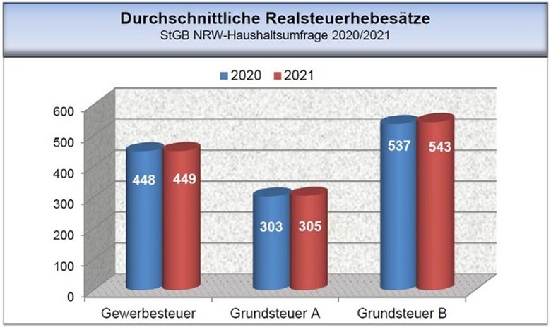 Für die Grundsteuer B wird mit einem Aufkommen von 1,863 Milliarden Euro (Plus 1,62 Prozent) gerechnet. Es kommt im Durchschnitt zu einer Anhebung der Hebesätze auf 305 Prozent bei der Grundsteuer A (Plus 2 Punkte) und auf 543 Prozent bei der Grundsteuer B (Plus 6 Punkte). Spitzenreiter ist hier die Stadt Bergneustadt, die auch 2021 den Hebesatz für die Grundsteuer B auf 959 Prozent festgesetzt hat. Hintergrund sind die energischen Bemühungen der Kommunen, ihre Haushaltsnotlage in den Griff zu bekommen. Den niedrigsten Hebesatz hat Verl mit 190 Prozent.