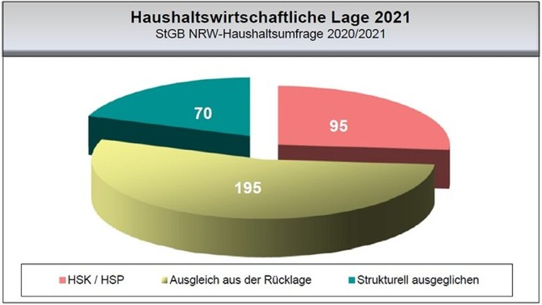Haushaltssicherung Ein wichtiger Indikator für die Finanzlage bleibt - auch in Pandemiezeiten - die Anzahl der Kommunen mit Haushaltssicherungskonzept (HSK) oder Haushaltssanierungsplan, soweit es sich um Stärkungspaktkommunen handelt. Ein HSK muss aufgestellt werden, wenn eine Kommune ihren Haushalt nicht einmal fiktiv ausgleichen kann und die allgemeine Rücklage mehr als nur unwesentlich verringern muss. 95 StGB NRW-Mitgliedskommunen erwarten diese Situation für 2021. Gegenüber dem Vorjahresstand von 103 Kommunen hat sich die Zahl somit um rund acht Prozent verbessert. Dass die Meldungen insoweit nicht deutlich negativer ausfallen, hängt wesentlich mit der Ausblendung vorhandener Defizite durch das NKF-COVID-19-Isolierungsgesetz zusammen.
