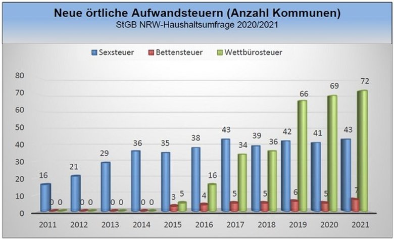 Seit 2011 untersucht der StGB NRW, inwieweit seine Mitgliedskommunen von den neuen Aufwandsteuern Gebrauch machen, die mittlerweile durch das für Kommunales zuständige Ministerium und das Finanzministerium NRW genehmigt worden sind. Im Jahre 2011 erhoben 16 Mitgliedskommunen eine so genannte Sexsteuer. Im Jahr 2021 sind es bereits 43 Städte und Gemeinden (siehe Schaubild 5). Ein Vergleich der Steuersätze ist allerdings nicht möglich, da sich die Steuermaßstäbe stark voneinander unterscheiden.