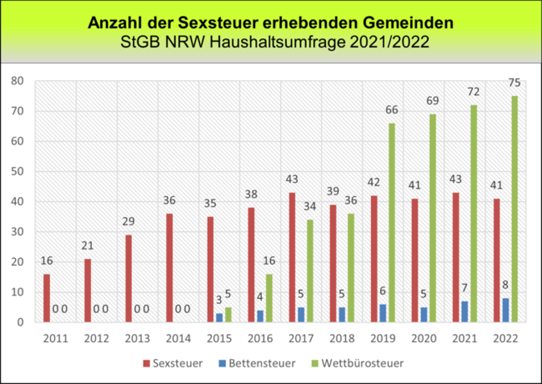 Seit 2011 untersucht der StGB NRW, inwieweit seine Mitgliedskommunen von den neueren Aufwandsteuern Gebrauch machen, die mittlerweile durch das für Kommunales zuständige Ministerium und das Finanzministerium NRW genehmigt worden sind. Im Jahr 2011 erhoben 16 Mitgliedskommunen eine sogenannte Sexsteuer. Im Jahr 2022 sind es bereits 41 Städte und Gemeinden (siehe Schaubild 5). Ein Vergleich der Steuersätze ist allerdings nicht möglich, da sich die Steuermaßstäbe stark voneinander unterscheiden.