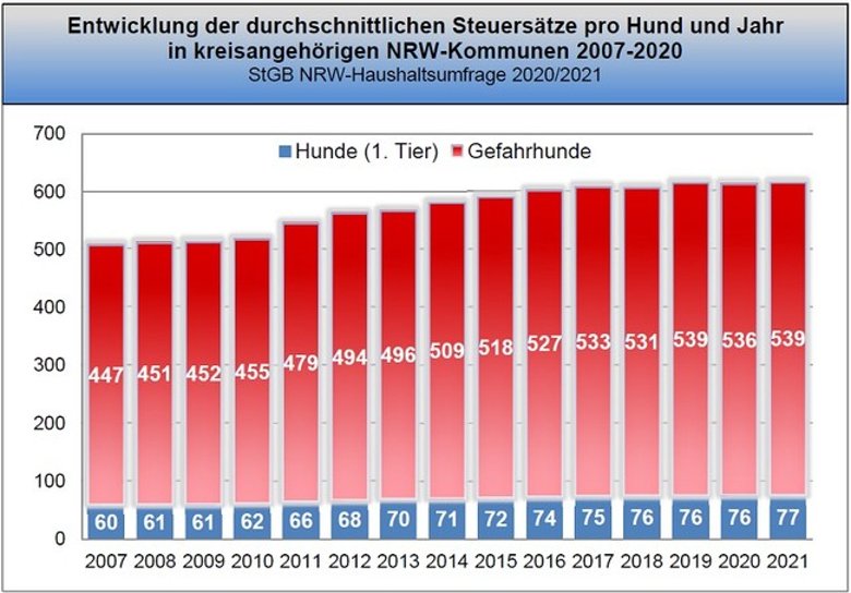 Hundesteuer In NRW erheben alle StGB NRW-Mitgliedstädte und -gemeinden eine Hundesteuer, wobei die Steuersätze pro Hund im Vergleich zum großstädtischen Raum moderat sind. Aktuell reichen sie von 25 Euro pro Hund und Jahr in Verl bis 168 Euro in Wülfrath. Durchschnittlich werden im Jahr 2022 rund 77,44 Euro pro Hund und Jahr fällig. Im Jahr 2007 betrug der durchschnittliche Steuersatz noch 60 Euro pro Jahr (siehe Schaubild 4).